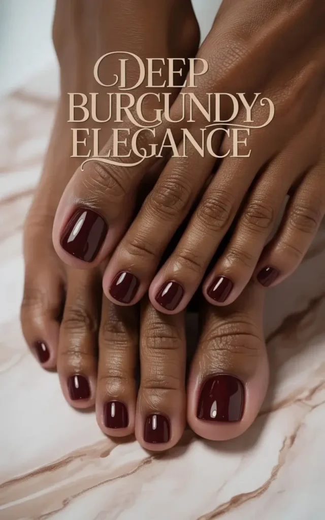 There’s nothing more timeless than a deep, wine-toned burgundy. This rich color exudes sophistication and complements the natural warmth of dark skin tones perfectly. It’s ideal for winter dinners, date nights, and formal occasions when you want your pedicure to whisper luxury.