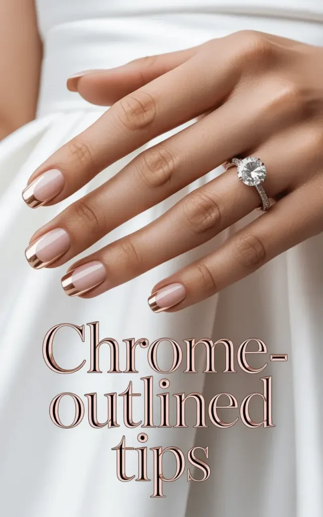 This futuristic trend is making waves for 2026 brides. Chrome-outlined tips combine a minimalist nude base with metallic edges, often in silver, rose gold, or champagne tones. The design elongates the nails visually and adds a refined metallic accent that pairs wonderfully with modern bridal jewelry.