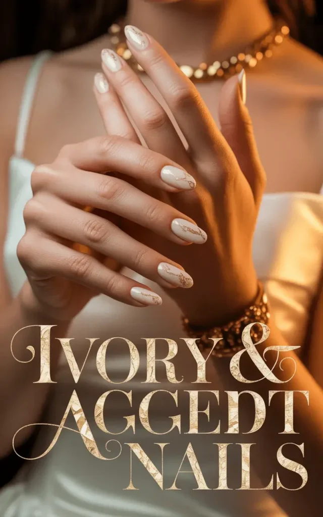 Ivory and gold nails combine classic bridal tones with a touch of luxury. The creamy white base paired with gold accents creates a royal, sophisticated vibe. It’s perfect for traditional weddings with golden jewelry or vintage elements.