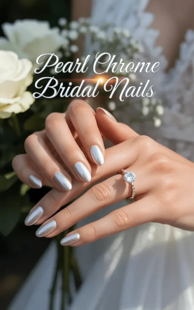 The beauty of pearl chrome lies in its adaptability — you can keep it minimalist with short almond shapes or add crystal accents for extra sparkle. Brides with cooler skin tones can opt for silvery undertones, while warmer skin tones glow best with golden or rose-pearl finishes.