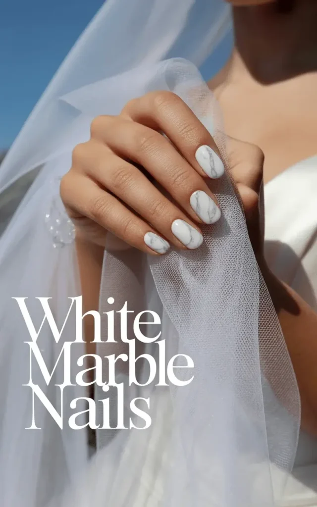 White marble nails are chic, elegant, and timeless. With swirling patterns of white and gray, they look natural yet luxurious. This design pairs well with silver or diamond jewelry, creating a cohesive bridal aesthetic.